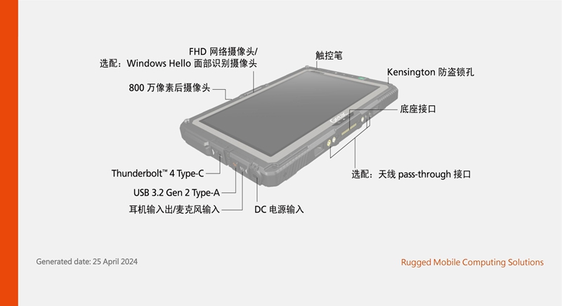 GETAC UX10 的核心优势在于它的 热插拔双电池设计。这意味着你可以在不关闭设备的情况下更换电池,实现真正的7x24小时不间断运行。对于需要轮班或长时间在户外作业的用户来说,这一点堪称“续航革命”。同时,它的扩展性同样出色,通过侧面的Thunderbolt" 4 Type-C接口,轻松选配 Microsoft身份验证工具套件、智能卡读卡器、HF RFID Antenna 等多种???。这种设计使其能够灵活应对 仓储盘点、设备巡检、数据采集 等截然不同的任务需求,而不是一台功能固化的“傻大个”。