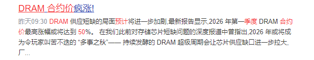 报告显示,DRAM(动态随机存取存储器)的合同价格预计在本季度(2026年 Q1)将暴涨 50%。这不仅仅是“涨价”,而是“价格休克”。