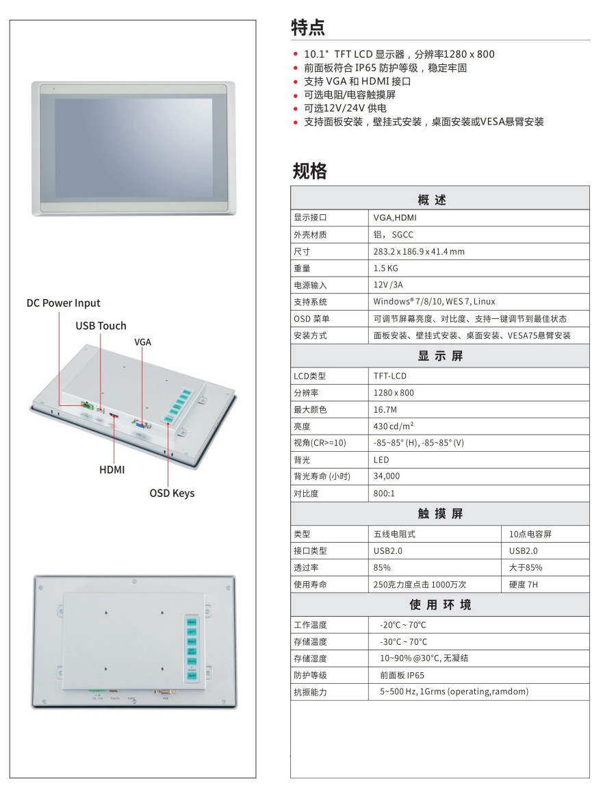设备提供VGA和HDMI双接口,兼容多种工业设备与主机的信号输入,方便系统集成 。用户可根据实际应用需求,在电阻式与电容式触摸屏之间灵活选择:电阻屏支持手套、触笔等介质操作,环境适应性广;电容屏则支持多点触控,提供更流畅灵敏的触控体验 。供电方式支持12V或24V直流输入,适应不同的现场电源配置 。